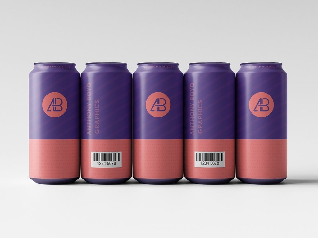 500ml 5 soda tin can mockups lined up beside each other. Inside the PSD file, you can change the design of all tins one by one through smart layers, but Tin base color can be changed at once. The background is also changeable. Thanks, anthonyboyd.graphics for sharing this free packaging mockup.