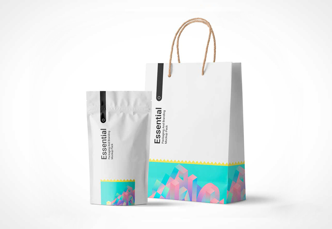 Sealed Pouch and Paper Shopping Bag PSD Mockup